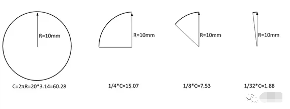 如上图,当弧长小于1/4周长C的时候,我们统称为大半径小圆弧,当弧长远远小于半径时,比如弧长等于1/32周长,要通过测量该小段圆弧确定半径R,这个测量过程会产生巨大的半径偏差。