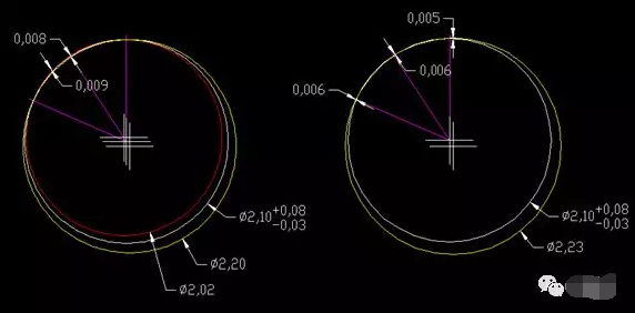 这说明了假如圆在2.10+0.08/-0.03范围内变动,并且圆弧两端部无任何变动的情况下,角平均线上允许的更大偏差只能控制在+0.003/-0.007范围内,而在实际测量中,圆弧两端的点、角平均线上的点以及圆弧其他任何位置上的点都会产生不同程度的变动,我们假设这些点都在0.005+0.005/-0.005范围内变动,虽然这个变动非常接近测量设备的极限精度,但是,所有变动点构造成的圆弧一定是产生大偏差的。
